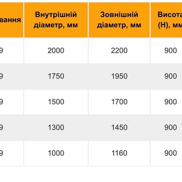 Кільця з дном (КЦД): Монолітна конструкція, що поєднує стінове кільце та днище. Це ідеальне рішення для герметичних відстійників та вигрібних ям, де важливо запобігти потраплянню стоків у ґрунт.
