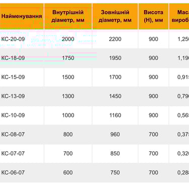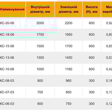Кільця стінові (КС): Основний елемент шахти колодязя або септика. Використовуються для формування робочої камери та горловини.